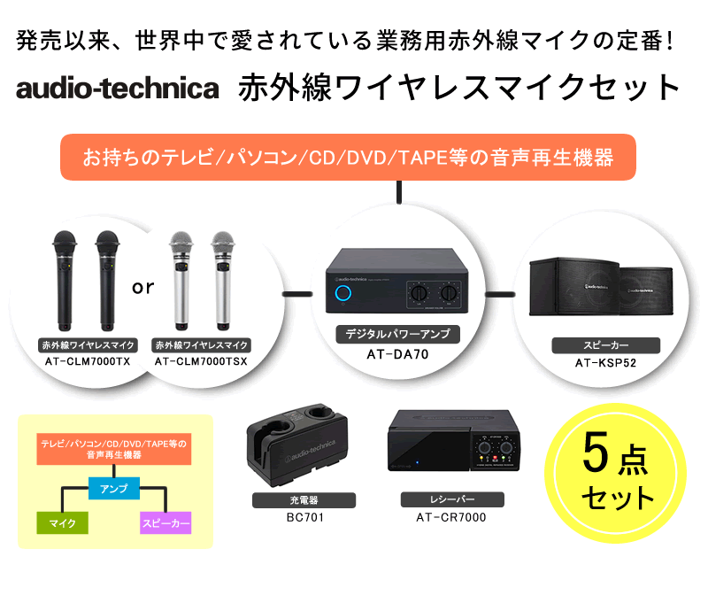 【全品クーポンで5%OFF!5月7日09:59まで】オーディオテクニカ(audio-technica)赤外線ワイヤレスマイクセット AT-CLM7000TX(2MHz帯)[マイク アンプ スピーカー レシーバー 充電器] 5点セット【購入者特典付き!】